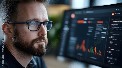 Focused and serious adult male with beard wearing glasses concentrates on analyzing data financial charts and information displayed on multiple computer screens in an office setting