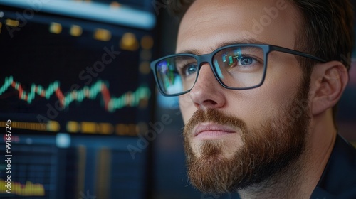 Focused businessman analyzing digital financial graphs on a screen.