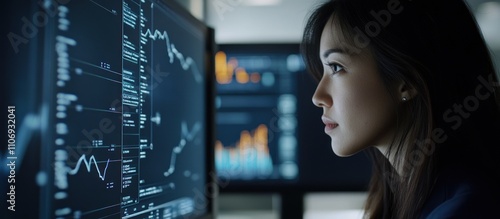 Focused businesswoman analyzing financial data on computer screen.