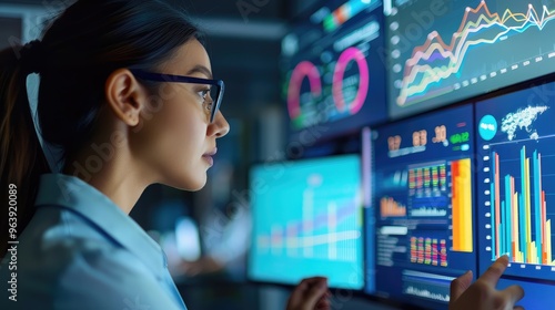 Focused Data Analyst Analyzing Complex Data Visualizations in a Modern Office