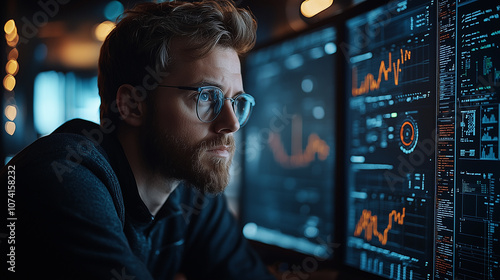 Focused data analyst examining financial trends on multiple monitors in dark office