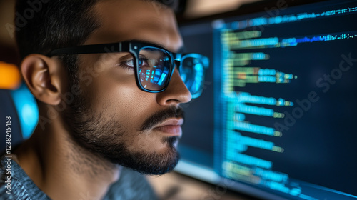 Focused developer coder wears glasses while looking at software code, cybersecurity data, digital technology.