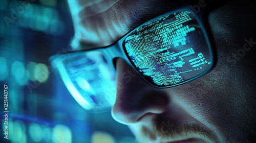 Focused developer coder wears glasses working on computer looking at programming code data cyber security digital tech reflecting in spectacles developing software program, focus on eye close up view.