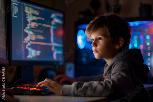 Focused developer kid coder working on computer looking at programming code data, investor or trader using data for trading stock market