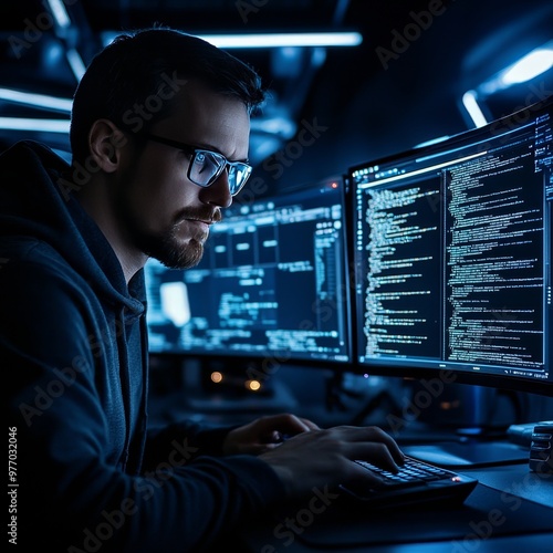 Focused Developer Working Late Analyzing Code and Programming on Computer in a Dark Office Setting