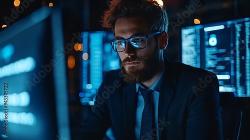 Focused Developer Working on Computer Code in Dark Office. Programming, Cybersecurity, IT Concept.