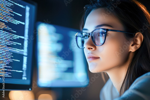 Focused female programmer in glasses working on code in a dimly lit environment, symbolizing technology, precision, and innovation.