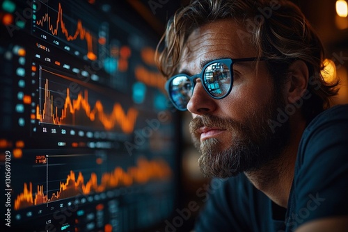 Focused individual analyzing data trends on a digital screen with reflections in glasses