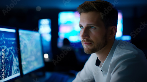 Focused male analyst looking at data on multiple screens in a dark control room, symbolizing cybersecurity and strategy.
