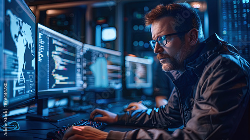 Focused Male Programmer Working on Computer in Data Center System Control Room With Multiple Monitors Showing Code and Data, Cybersecurity and Software Development Concept, Side View Portrait