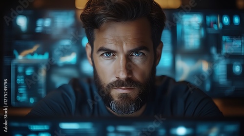 Focused Man Monitors Data at Night
