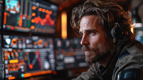 Focused man with headset analyzing complex data on multiple screens in a high-tech environment, showcasing intense concentration and technology.