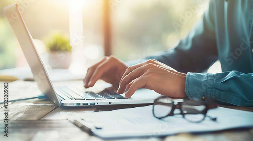 Focused Office Worker Typing on Laptop in Bright Sunlit Workspace