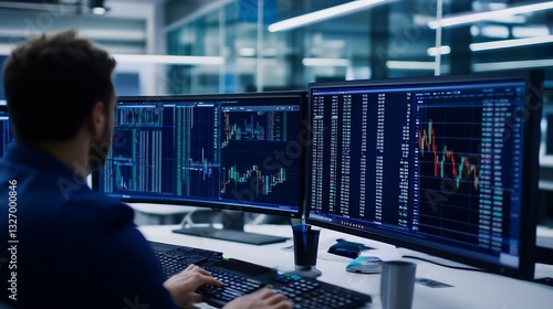Focused professional analyzing data on multiple computer screens in modern office space : Generative AI