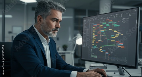 Focused Professional Reviewing Complex Project Data on a Modern Monitor