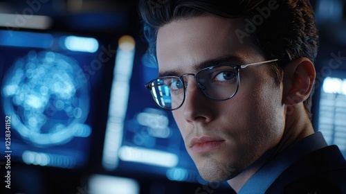 Focused Programmer, A young programmer intensely concentrates on his work, illuminated by the glow of computer screens displaying complex data streams
