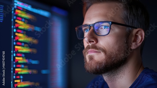 Focused Programmer Analyzing Code on Computer Screen