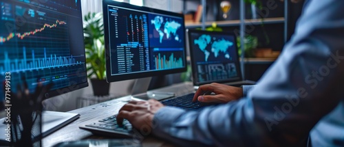 Focused programmer coding on multiple computer screens in dark office. development concept