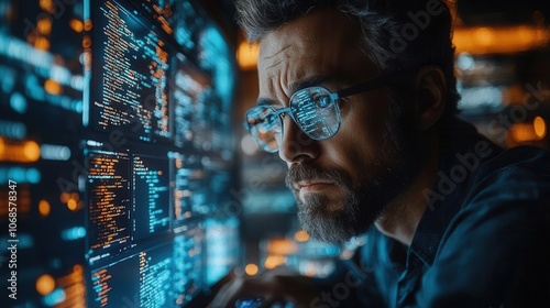 focused programmer engaged in professional development, typing on a laptop with coding language interfaces visible on multiple screens, illustrating a tech-savvy workspace