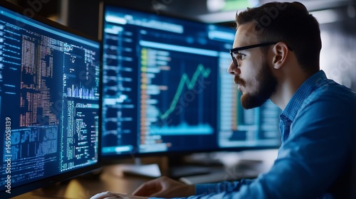 Focused programmer reviewing code on multiple monitors, illuminated by screen glow, late night work, software development, data analysis, problem solving. : Generative AI