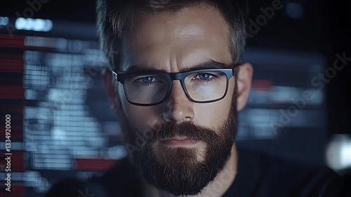 Focused programmer with beard and glasses working late at night.