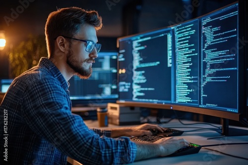 Focused programmer working late, coding on large monitors. Illustrates dedication, late-night work, and software development.