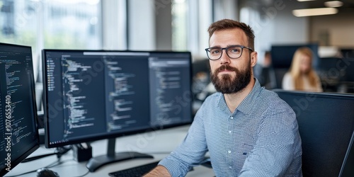Focused programmer working on complex coding projects in a modern office.