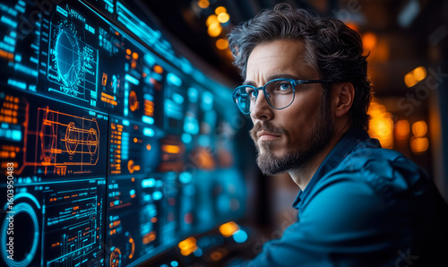 Focused software engineer analyzing complex futuristic digital interface with holographic data visualizations in dark tech environment for enterprise solutions development and innovation