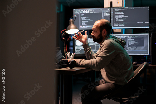 Focused software engineer thinking about source code to develop database online cloud, brainstorming ideas after hours. Being pensive and working on system interface, app programming.