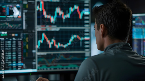 Focused trader studying a webinar for trading strategies, surrounded by computer monitors and notes.