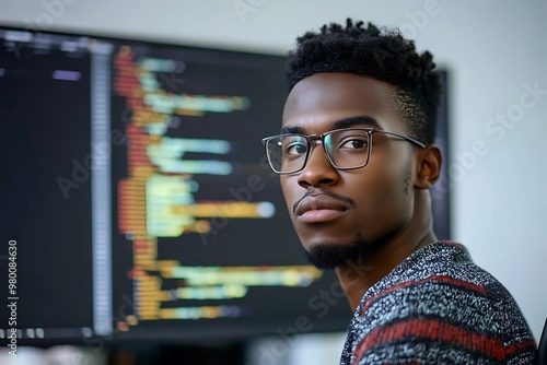 Focused young black programmer looking at camera in front of computer screen with code. Concept of coding, software development, technology, innovation