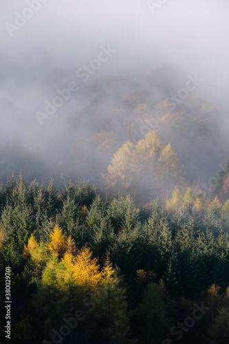 Fog from a cloud inversion floating over trees on a mountainside