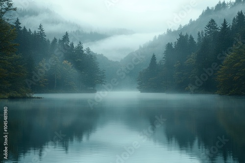 Foggy Forest Lake with Silhouetted Trees