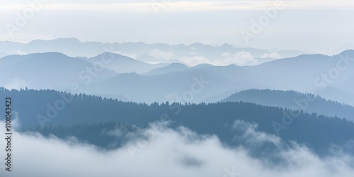 Foggy mountain range with misty peaks and valleys, landscape, atmosphere, weather