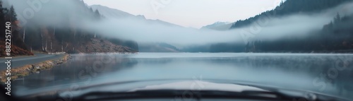 Foggy mountain road view from car with misty sky and serene lake, creating a peaceful and tranquil landscape scenery.