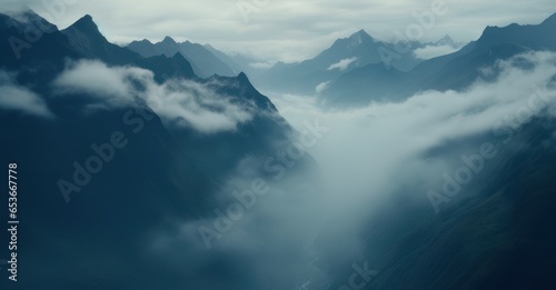 fog-kissed mountain range unveiling the enigmatic dance of shadows and light