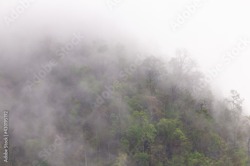 Forest, trees on the mountain with a thin mist in the morning, caused by rain at night. Summer forest in Thailand after a summer storm But makes good air Remove dust and smoke caused by forest fires.