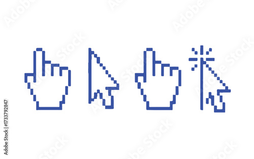 Four Pixelated Computer Mouse Cursors on White Background Keywords: cursor, mouse, pointer, click, hand, arrow, digital, computer, graphic, icon