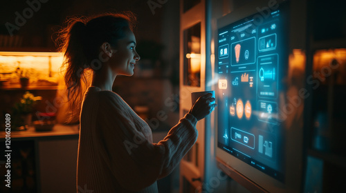 Frau steuert Smart Home mit unsichtbarer Augmented Reality in modernem Zuhause. Generative AI KI