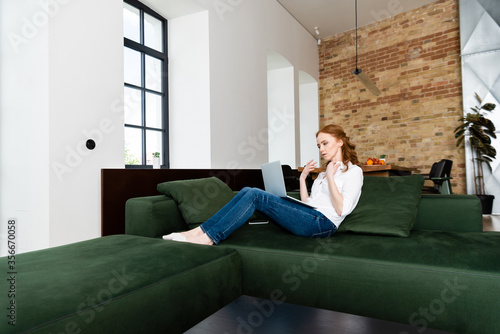 Freelancer suffering from heat while using laptop on couch