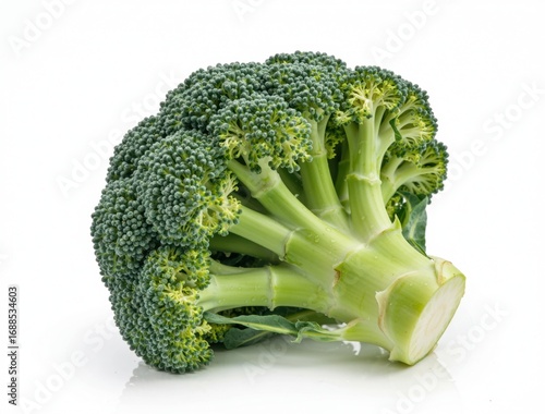 Fresh broccoli crown resting on white reflective surface