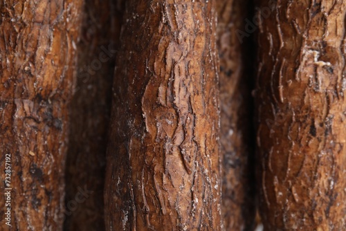 Fresh cassava roots as background, top view