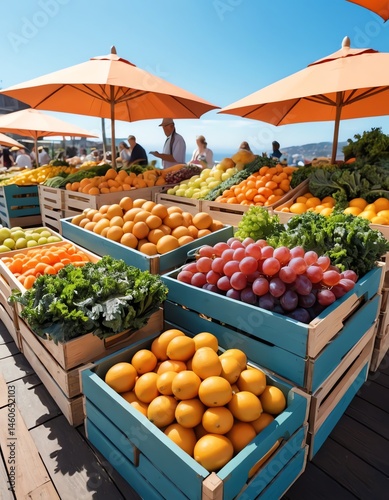 Fresh Fruit and Vegetable Stand with Oranges, Grapes, Kale, Carrots, Lemons