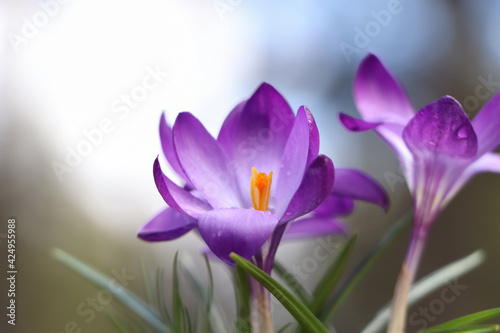 Fresh purple crocus flowers growing on blurred background