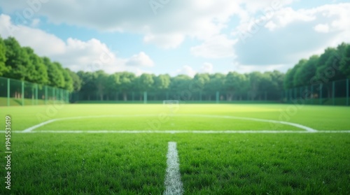 Freshly Cut Green Grass Field with White Line Marking Under Cloudy Sky in a Sports Complex Setting