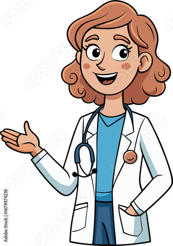 Friendly Cartoon Female Doctor Gesturing to the Side