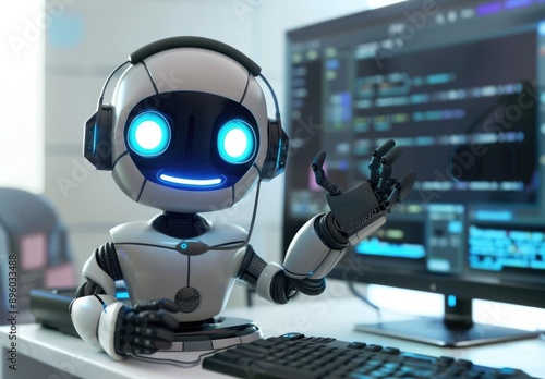 Friendly Robot Assistant with Headset at a Computer