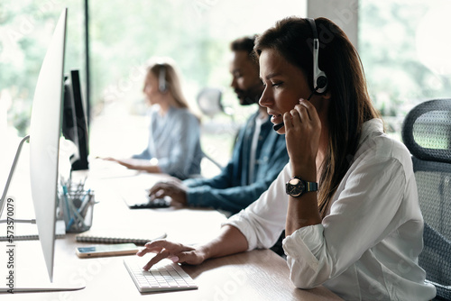 Friendly smiling woman call center operator with headset using computer at office.