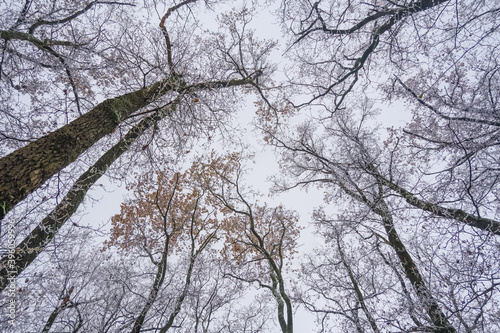 Frozen Leafless trees view from bottom up