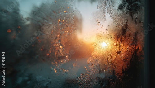 Frozen window pane, sunrise view